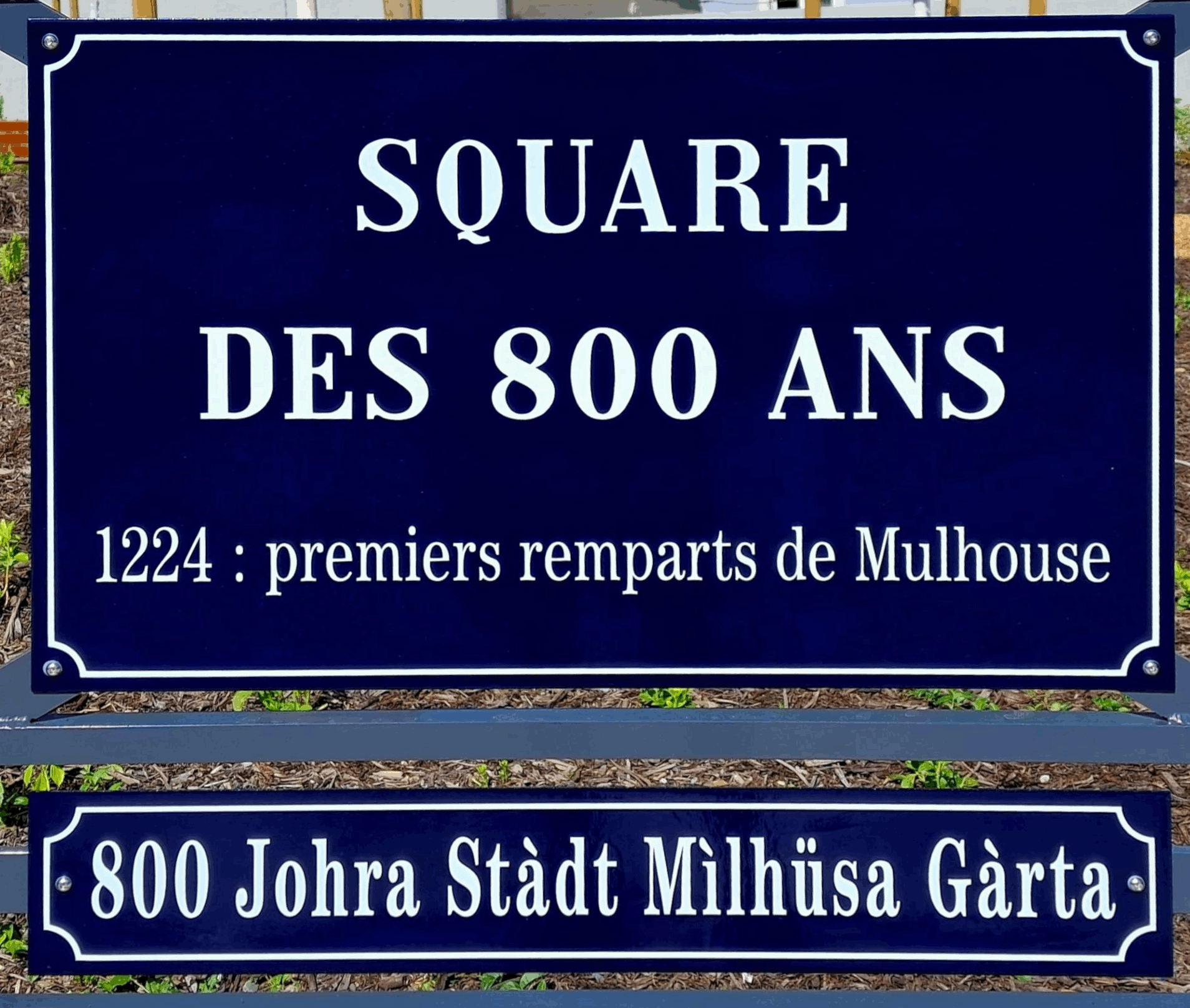 1 800 ans (Square des) 800 Johra Stàdt Mìlhüsa Gàrta En ce début de mai 2025, Mulhouse a vu fleurir sa 350ème plaque bilingue. Elle se situe au niveau du tout nouveau square créé à l'angle des boulevards Stoessel et de la Marne et rend hommage au 800è anniversaire de l'érection des remparts de la ville.
